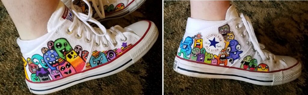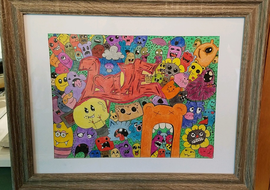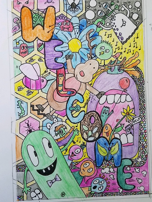 I penciled my doodles, inked them, then colored them. Needs a bit more polish, a mat and frame, then I think I’ll hang it on my office door! It was so much fun, I’ve already got ideas for more.