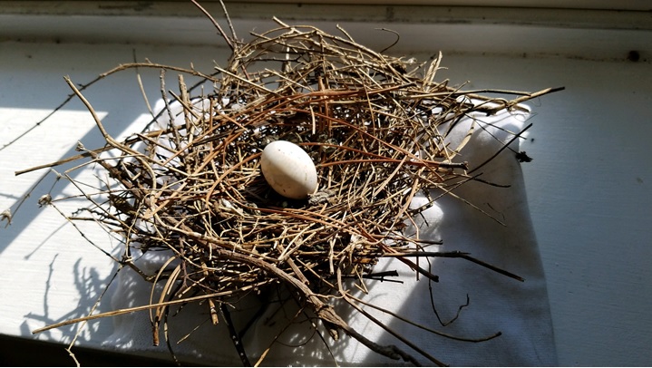 This is the nest of a mourning dove. When my son found it in the branches of a cedar tree, it was abandoned but still had one egg in it.